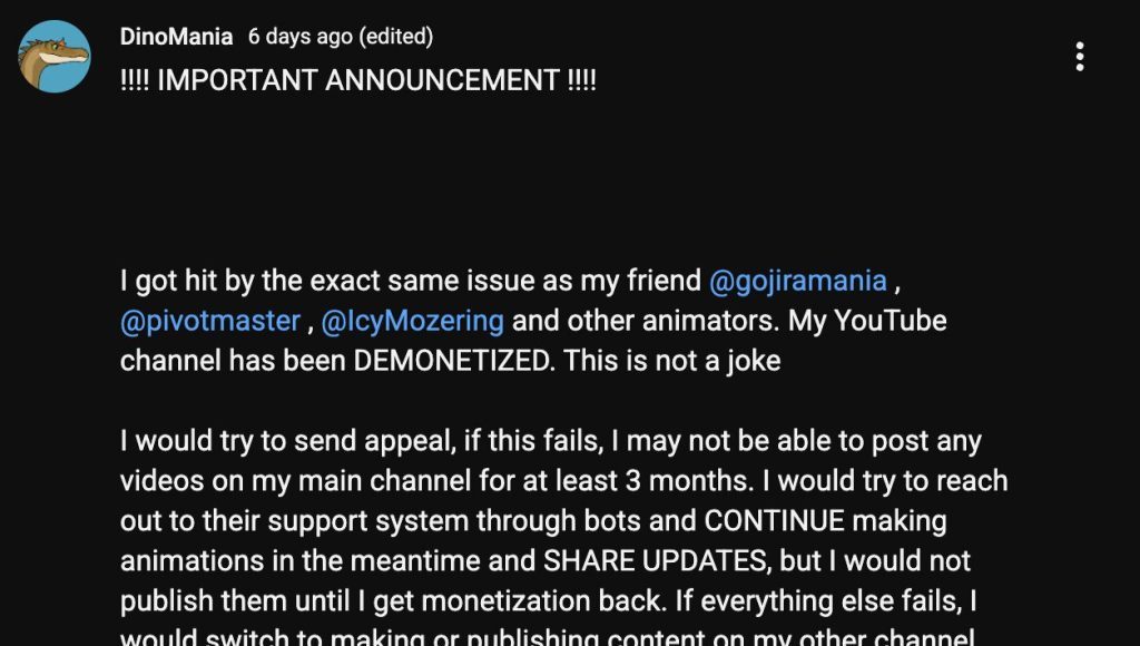 Some YouTube creators are upset after popular animation channels were demonetized following changes tied to AI content. This comes shortly after YouTube removed major “AI slop” channels, and now animation channels that use similar AI-assisted content formats, specifically kaiju/dinosaur animators, are seeing demonetization under the updated rules.